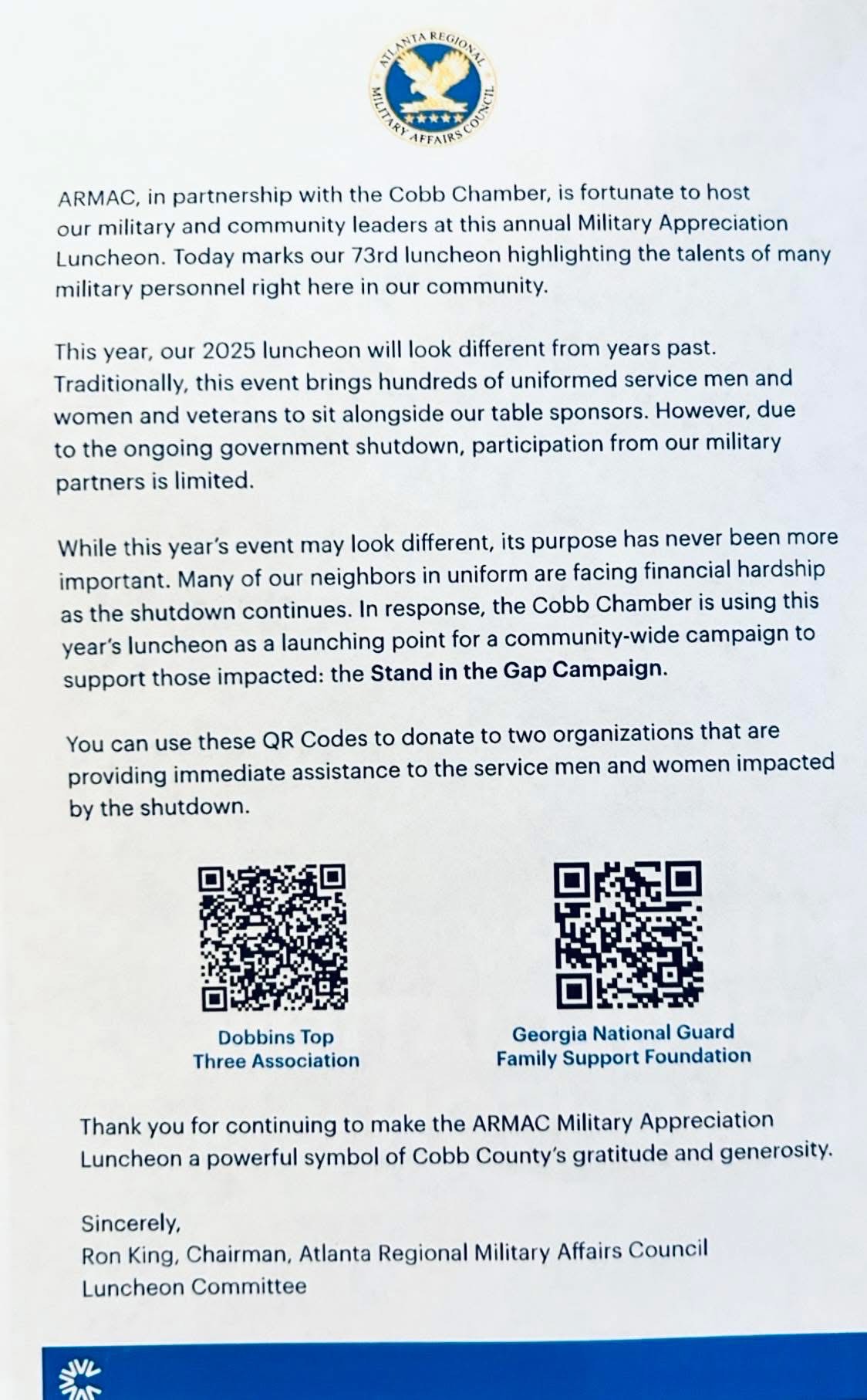 Thank you for continuing to make the ARMAC Military Appreciation Luncheon a powerful symbol of Cobb County's gratitude and generosity.