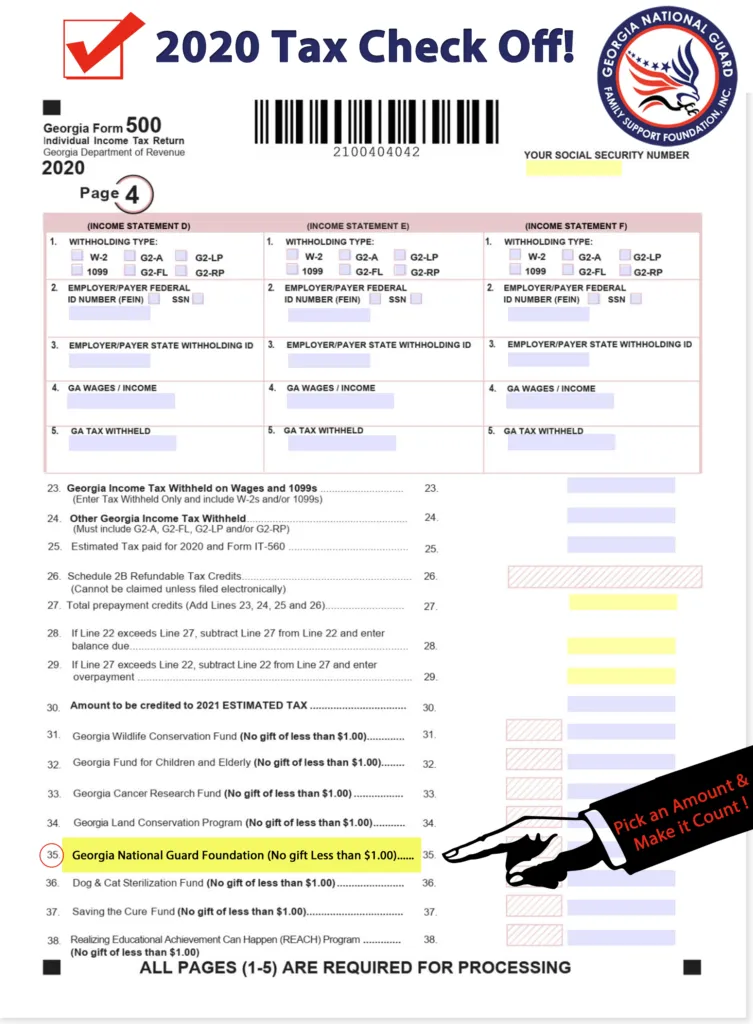 A simple “check-off” box on Georgia Form 500 Individual Income Tax Return allows taxpayers to make donations that will be automatically deducted from their refund or included in their payment. The Foundation is one of nine charities approved by the Georgia Legislature with this special designation. More than $1,102,827.00 in donations have been collected for the Georgia National Guard Foundation from Individual Georgia Taxpayers through the Georgia Department of Revenue since 2005!