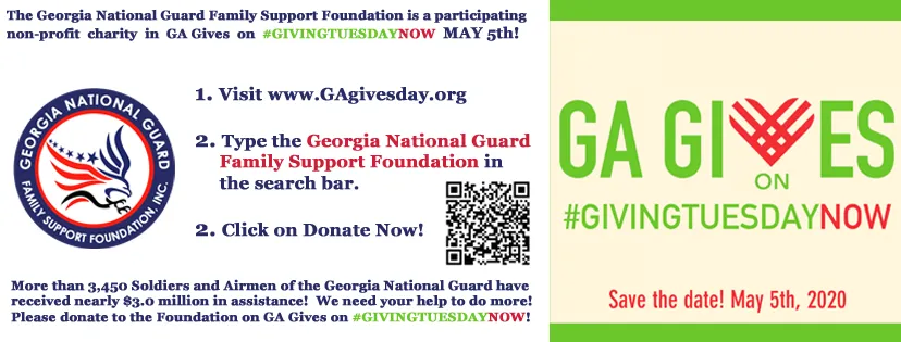 Special thanks to GA Gives for this special opportunity to recognize non-profit organizations throughout the State of Georgia on 5 May 2020, including The Georgia National Guard Foundation. We would appreciate your support to help Soldiers and Airmen of the GA National Guard that are impacted due to COVID-19 with job loss, reduced hours and other hardships. Thank you!