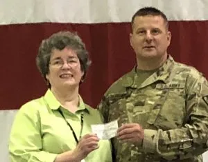 Check was presented by MAJ Darrel Geving to Harriet Morgan, Program Manager for the Foundation, on July 13, 2018.