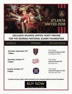 Atlanta United FC is an American professional soccer club based in Atlanta, Georgia. Through its association with the Atlanta Falcons, the Georgia National Guard Foundation, has been approved for exclusive pricing for upcoming games during the 2018 season at the new Mercedes Benz Stadium! After their high-energy and exciting performances last season, we are excited to share this opportunity!