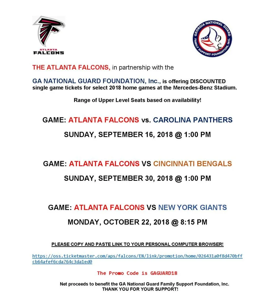 RISE UP! The Atlanta Falcons are offering discounted single game tickets through the GA National Guard Foundation for select 2018 home games at Mercedes Benz Stadium.