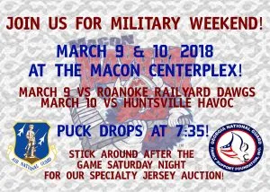 Macon Mayhem Hockey is hosting a Military Weekend on 9-10 March 2018 at the