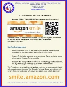 Attention All Amazon Shoppers! Please visit http://smile.amazon.com to register the Georgia National Guard Family Support Foundation as YOUR charity and start shopping at smile.amazon.com. ! Thanks for your support!