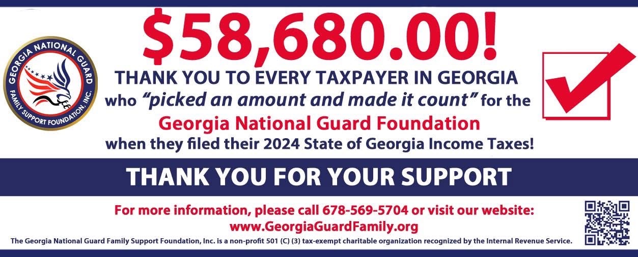 58,680.00! THANK YOU TO EVERY TAXPAYER IN GEORGIA who “picked an amount and made it count” for the Georgia National Guard Foundation when they filed their 2024 State of Georgia Income Taxes! Since 2005, a simple “check-off” box on Georgia Income Tax Form 500 allows individual taxpayers to make donations that will be automatically deducted from their refund or included in their payment to the Georgia Department of Revenue. Over $1,466,459.00 collected since 2005! Individual and corporate donations and the impact and success of our fundraising events make a difference in the lives of many Soldiers and Airmen of the Georgia National Guard facing unexpected financial hardships. As a result, the Foundation has been able to approve more than $3.6 million dollars in emergency relief assistance to over 4,000 members of the Georgia National Guard and their families. Please remember to “pick an amount and make it count” for the Foundation when you file your Georgia Tax Return on Form 500 for 2025!