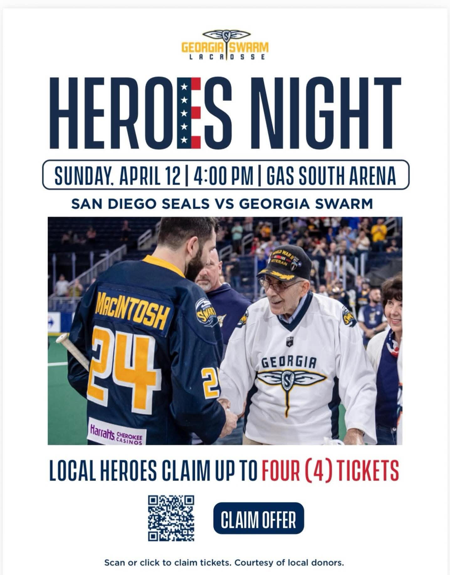 Georgia Swarm Lacrosse HEROES NIGHT Sunday, April 12th, 2026! Complimentary Tickets!!