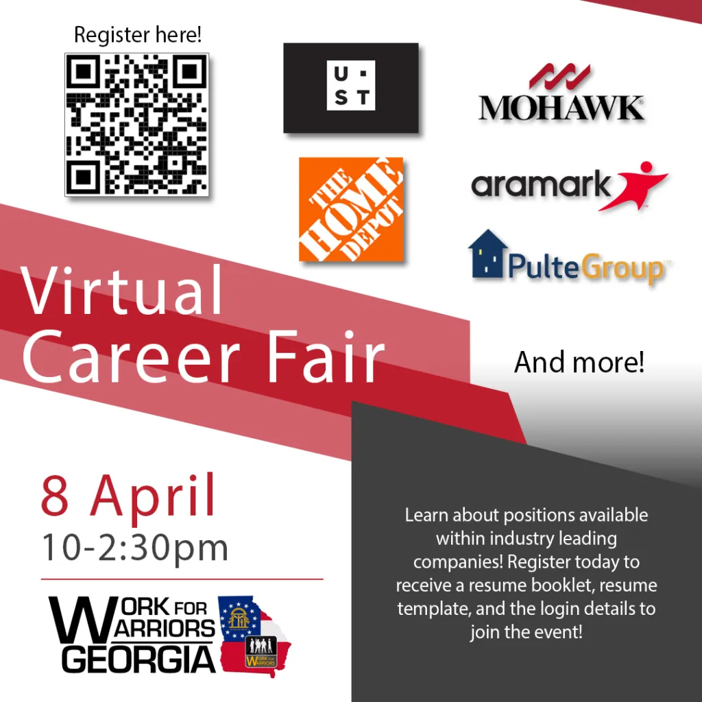 Join WFWGA for a Virtual Hiring Event on 8APR22 from 10:00-2:30pm. Participating employers include UST, The Home Depot, Mohawk, Aramark, PulteGroup and more. Participants will have an opportunity to learn about employment opportunities, the company and ask questions from the participating Employers and more. Don’t miss out on this great opportunity.